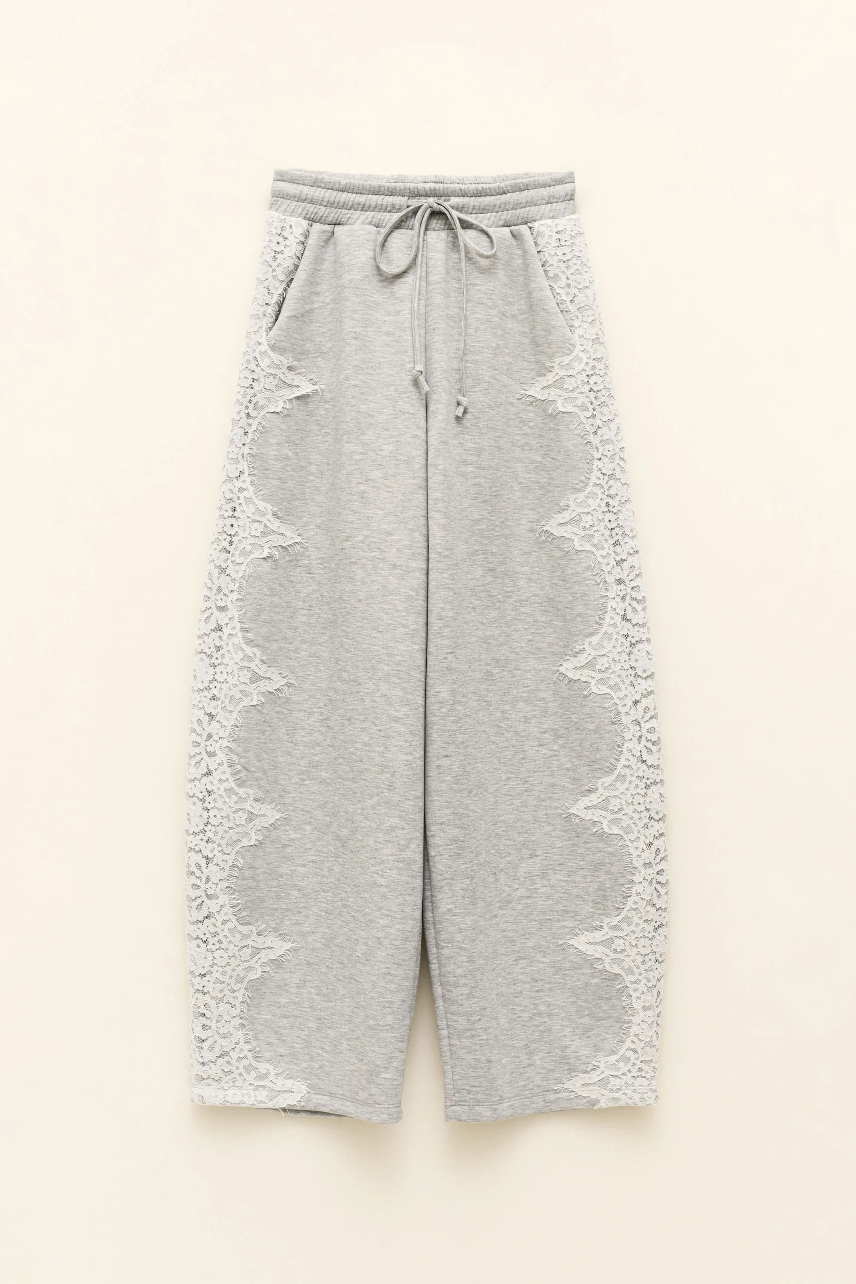 Gris jaspeado, cintura elástica con cordón y ese detalle lateral de encaje que transforma totalmente la silueta. La mezcla perfecta entre sporty y delicado.