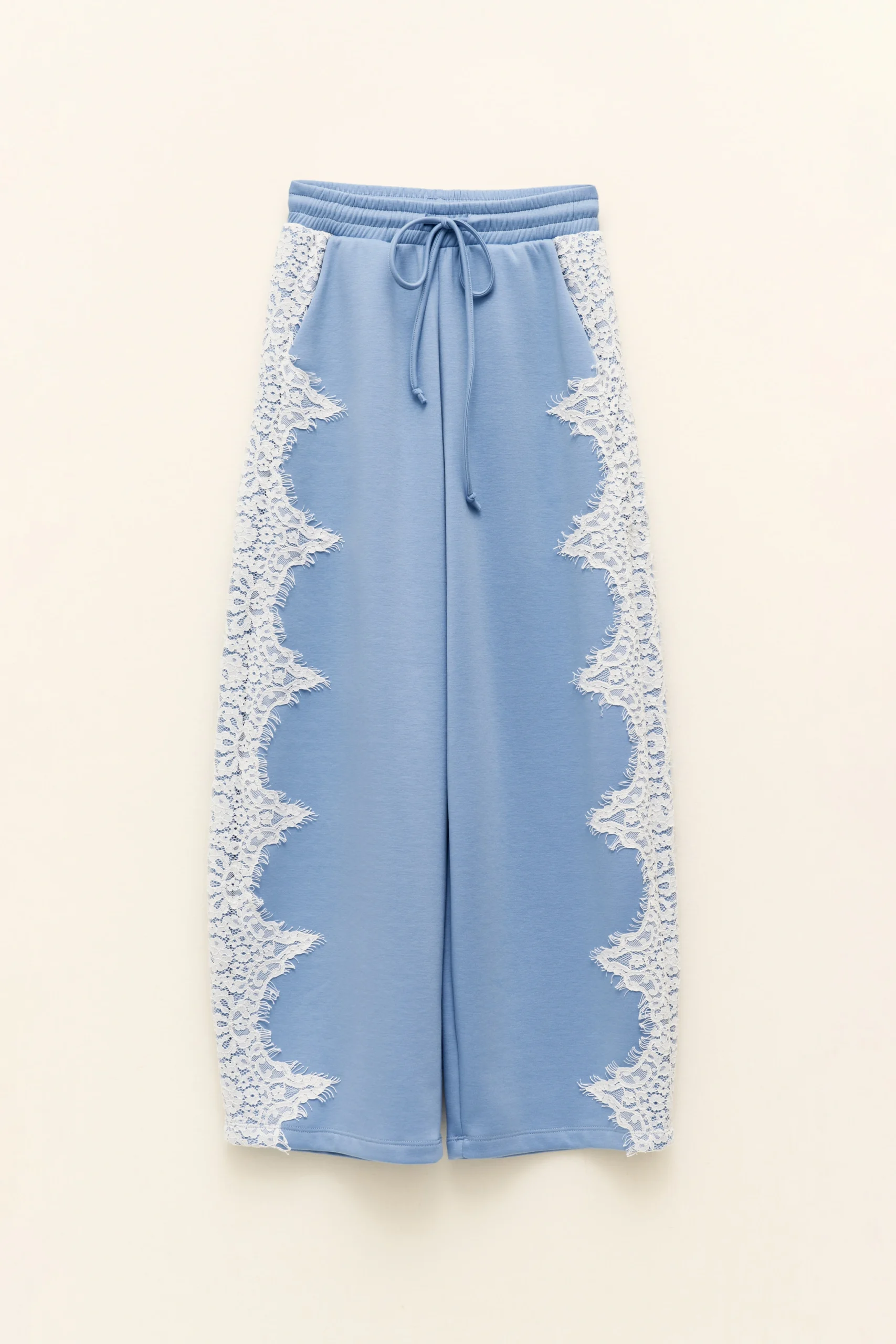 Pantalón azul cielo de caída fluida, cintura elástica con cordón y paneles laterales de encaje que estilizan y elevan el diseño. La mezcla entre tejido sporty y detalle romántico lo convierte en algo totalmente diferente.