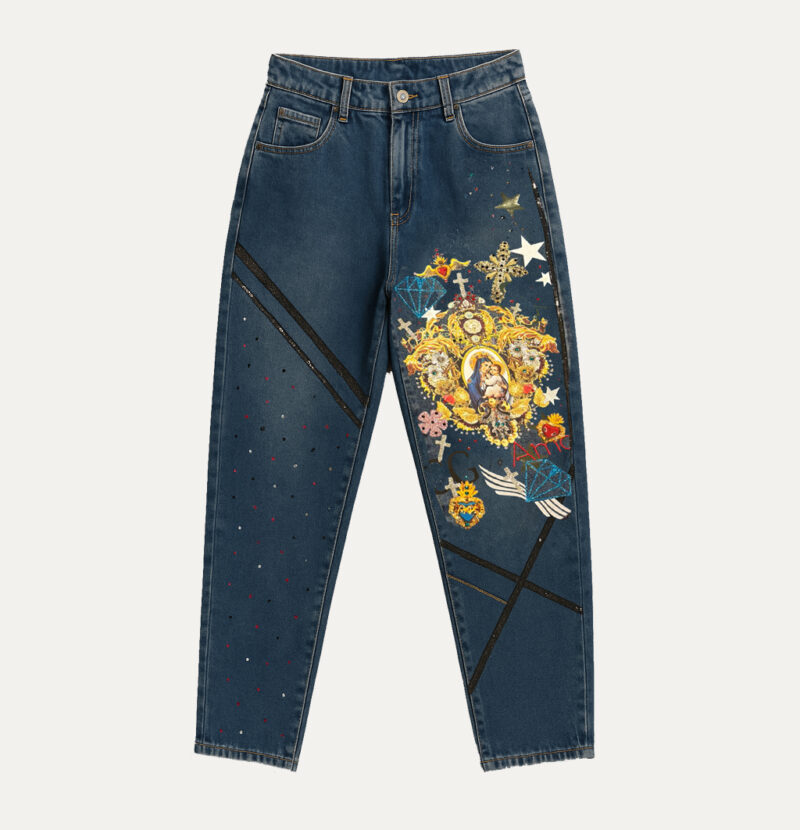 La pernera derecha es un lienzo completo: un espectacular motivo barroco a todo color que enmarca una imagen central de inspiración clásica, rodeada de flores, cruces, estrellas y elementos joya que brillan gracias a bordados, aplicaciones metálicas y toques de glitter. Diamantes turquesa, alas blancas, corazones y iconografía ornamental se entrelazan creando un collage vibrante y lleno de simbolismo.